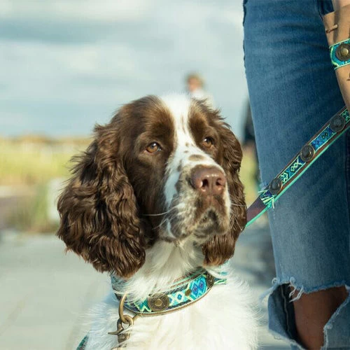 DWAM Halskette Boho Juan ist ein tolles Halsband für Hunde. Dieses blaue mit türkisfarbenem Halsband ist mit schönen Messingdetails verziert.