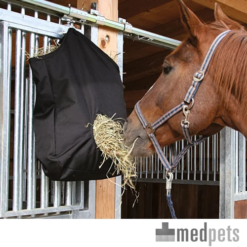 Dieser Heusack von der Marke Kerbl ist ein praktischer Sack, um Heu für Ihr Pferd oder Pony hineinzutun. Er ist ideal zum Mitnehmen auf ein Turnier oder auch für den Einsatz während des Transports von dem Tier. Der Sack besitzt eine runde Öffnung, durch die das Pferd das Heu herausholen kann. Sie können den Heusack sehr einfach über die Öffnung entlang der Oberkante von dem Beutel mit Heu befüllen. Das Produkt ist aus Polyamid gefertigt und wird mit zwei praktischen Ringen zum Aufhängen liefert.